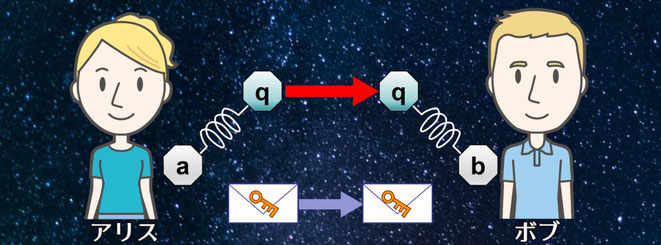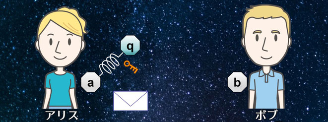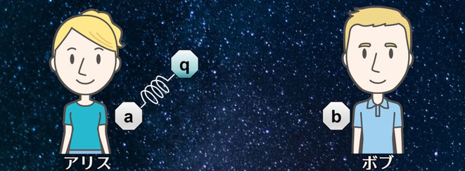 たとえば宇宙で遠く離れた場所にアリスとボブがいて、アリスはボブに「量子テレポーテーション」で量子情報qを送りたいと思っている。