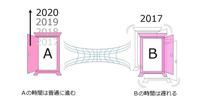 「ドアA」の時間は普通に進むのに対し、「ドアB」の時間は特殊相対性理論により時間の進みが遅くなる。