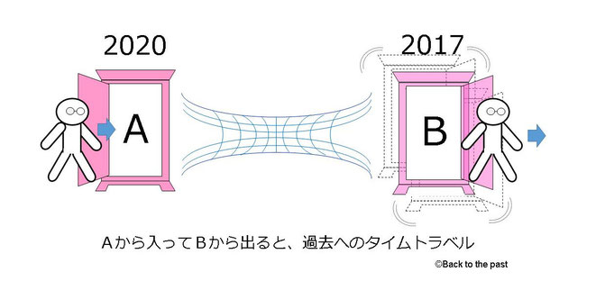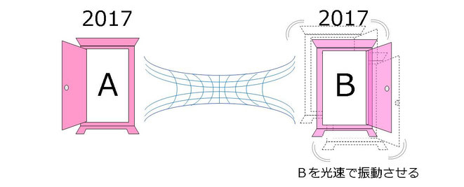 2つの離れた空間を結ぶワームホールでつながれた「どこでもドアA」と「どこでもドアB」を用意し、「ドアB」を光速で振動させる。