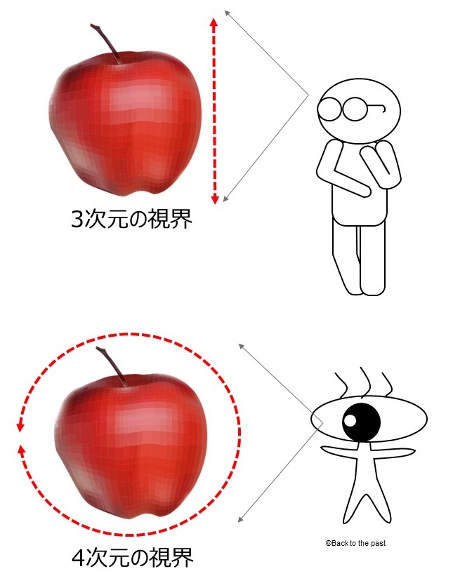 対して、タテ・ヨコ・奥行きにもう1つの次元をプラスした4次元空間に住んでいる4次元人なら、文字通り3次元(立体)で対象をとらえることができる。