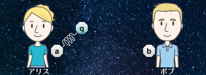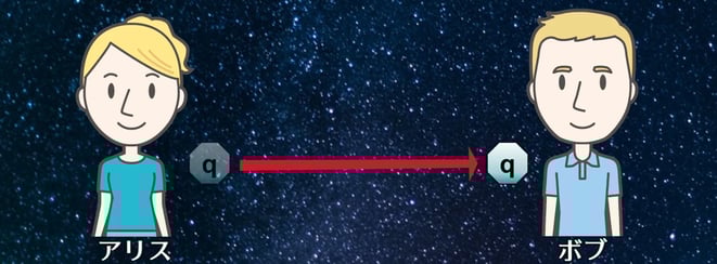 たとえば宇宙で遠く離れた場所にアリスとボブがいて、アリスはボブに「量子テレポーテーション」で量子情報qを送りたいと思っている。