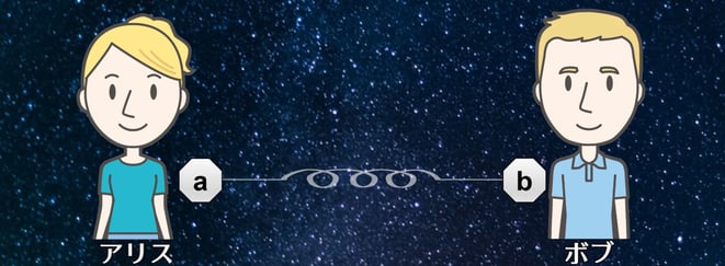 まず量子もつれ状態の粒子aとbが、アリスとボブに渡される。