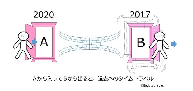 2つの離れた空間を結ぶワームホールでつながれた「どこでもドアA」と「どこでもドアB」を用意し、「ドアB」を光速で振動させる。