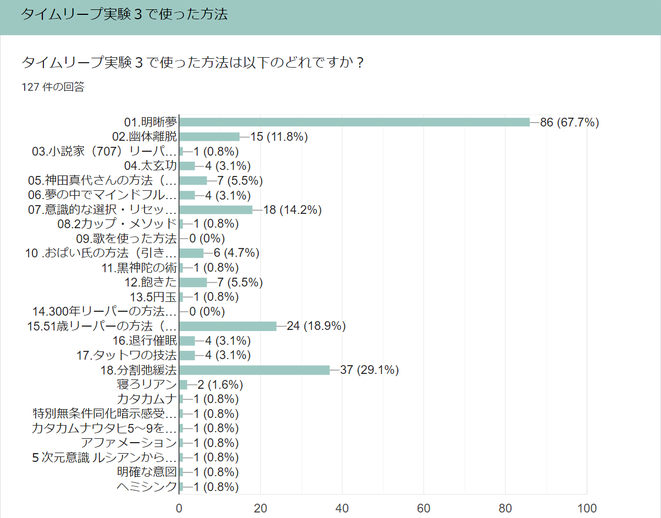 タイムリープ実験3で使った方法は、夢の中で今夢を見ていると気づく「明晰夢を見る方法」が67.7%。2番目が分割弛緩法が29.1%、それから51歳リーパーの方法18.9%、意識的な選択14.2%、幽体離脱11.8%と続く。