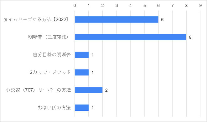 バーチャル・タイムリープに成功した人が使った方法は、「二度寝法」が8、「2022」が6。